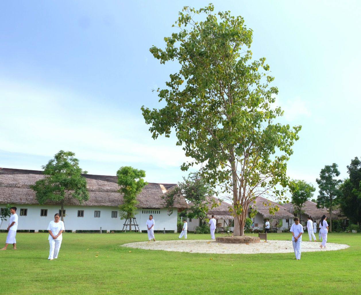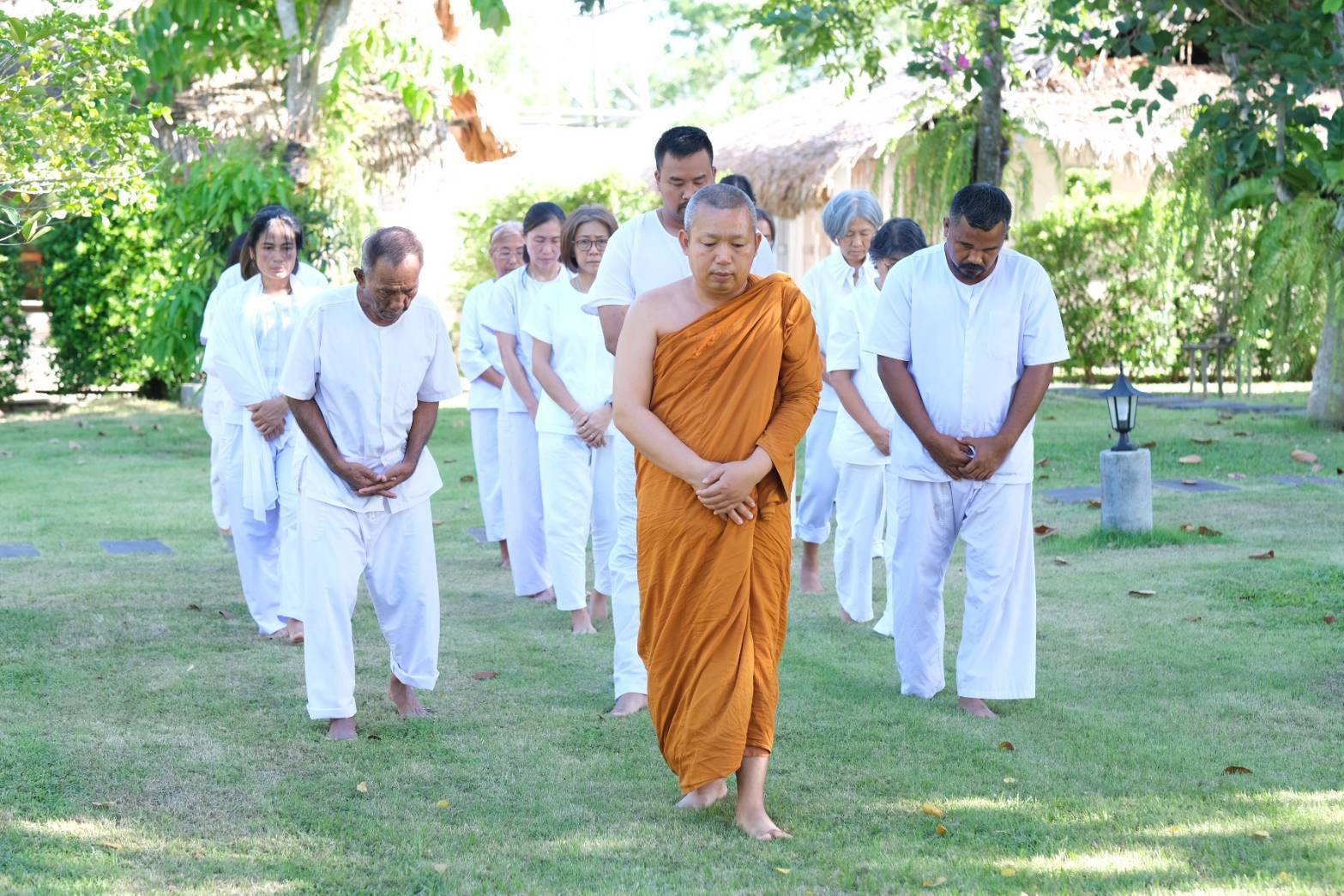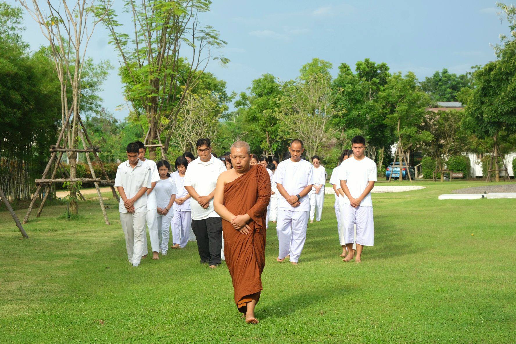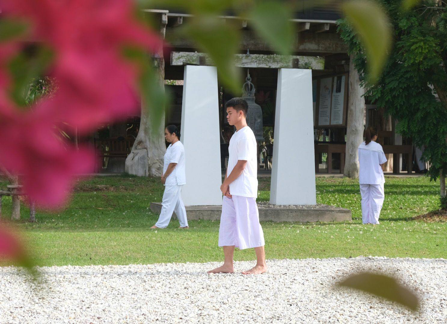 เดินจงกรมฝึกสติบนพื้นหญ้า รับพลังธรรมชาติ ทำงานอาสา